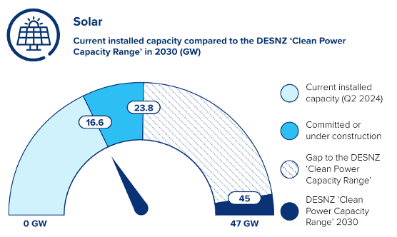 The Plan sets ambitious targets, which include 45-47 GW for solar. The image below shows that currently there is 16.6 GW of current installed capacity in the UK with this increasing to 23.8 GW of committed projects or those under construction. The National Energy System Operator (NESO) and the Department of Energy Security and Net Zero (DESNZ) expect a need for between 45-47 GW of solar by 2030, which is a significant increase from current installed capacity.